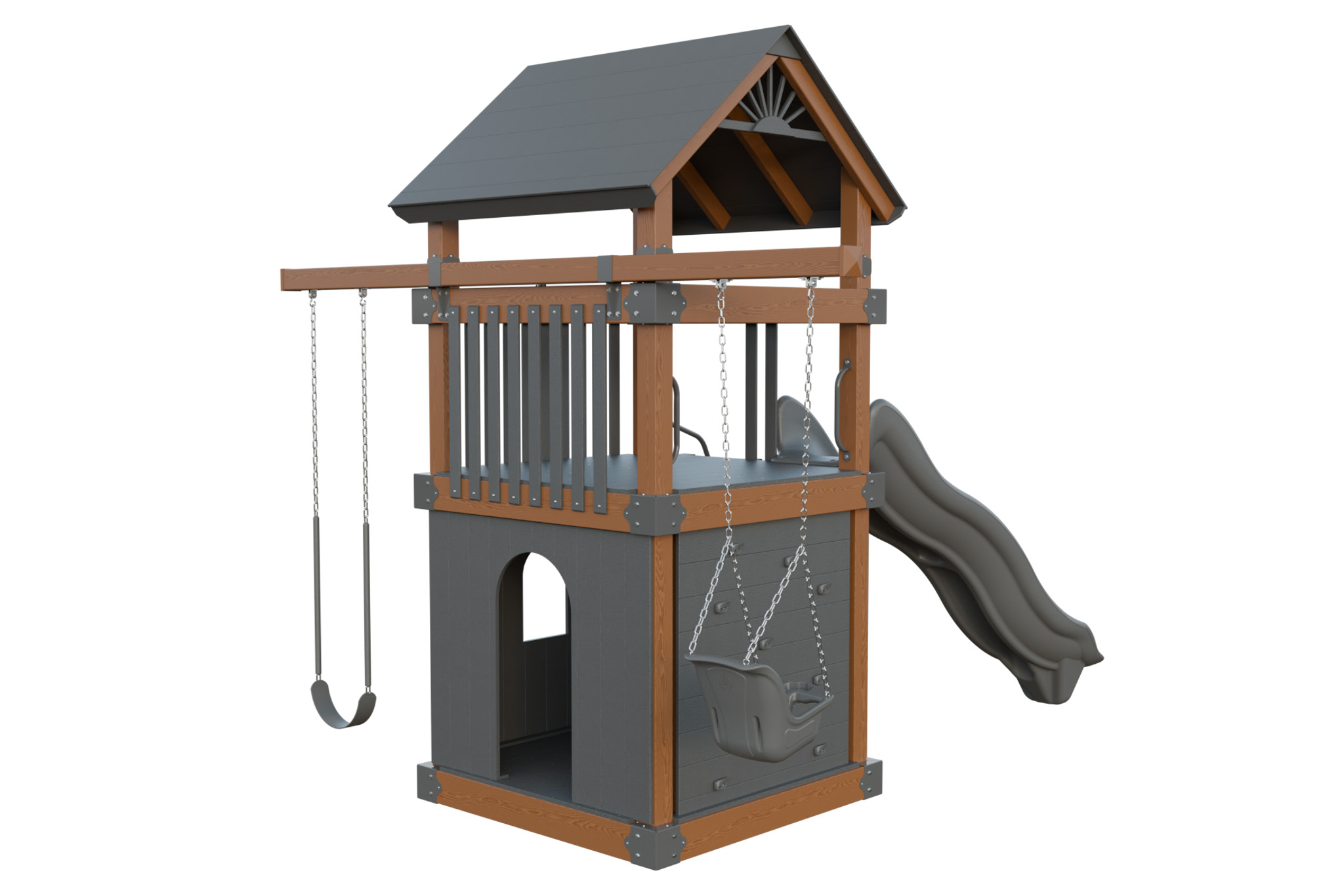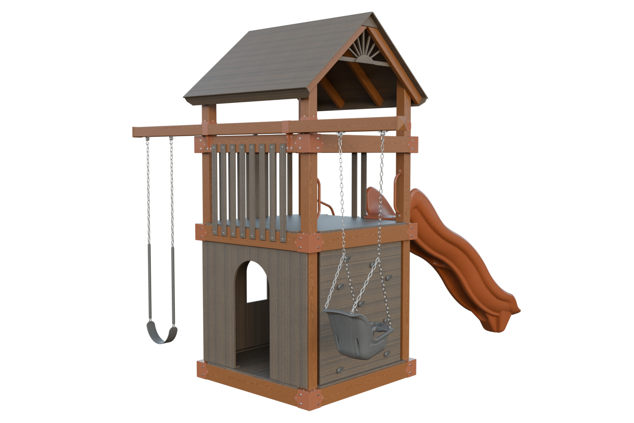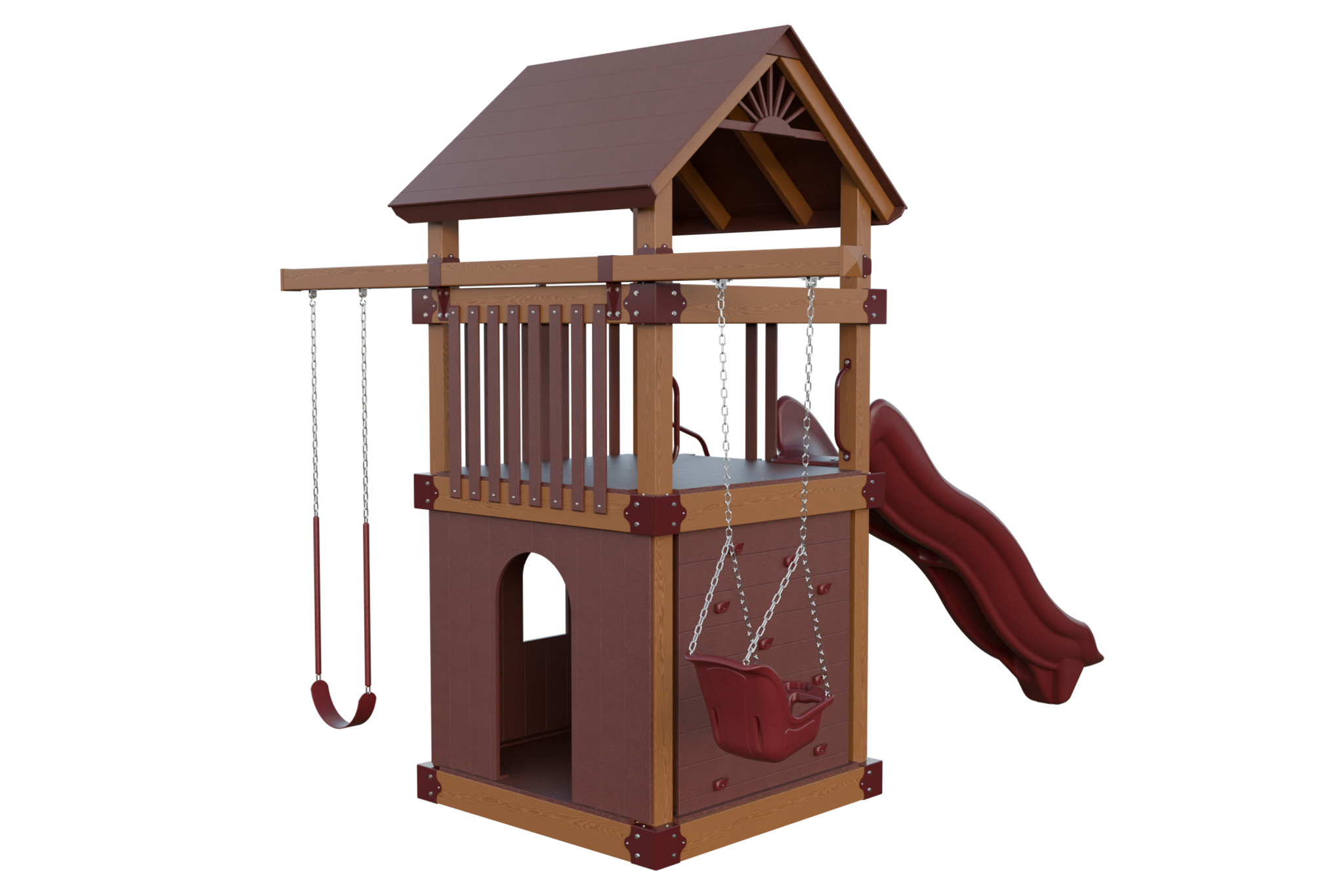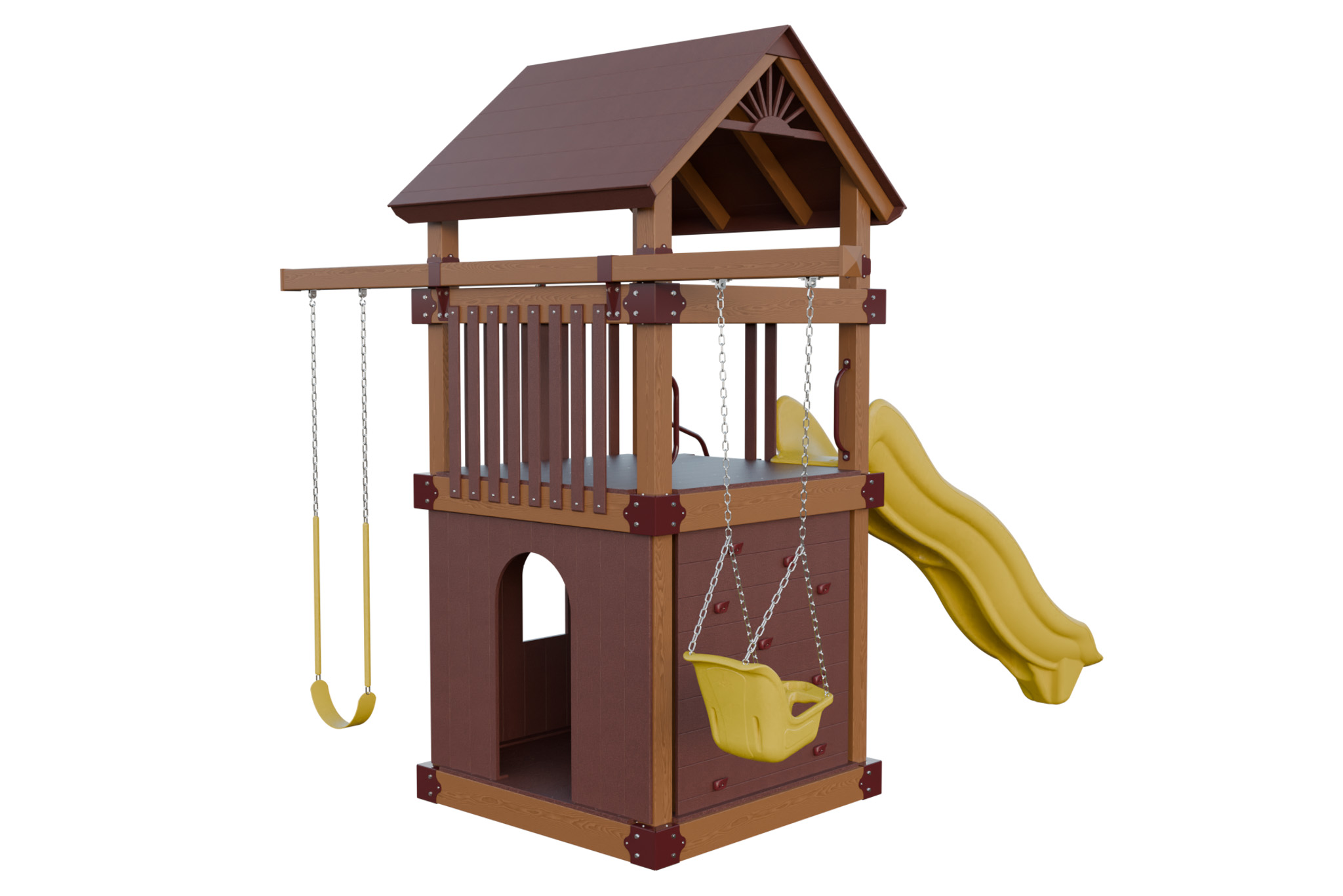 Basecamp 55 Clubhouse combines a roomy tower with an enclosed clubhouse where kids share secrets and play pretend. A 5′ deck height leads to a smooth slide and a three position swing beam. Vinyl materials stay cool and splinter free. You provide a safe hangout that keeps children outside and encourages social play. Families love how this set becomes the hub of the backyard while requiring almost no maintenance. This model includes the Wood Grain Upgrade, a premium vinyl color option that adds to the price.