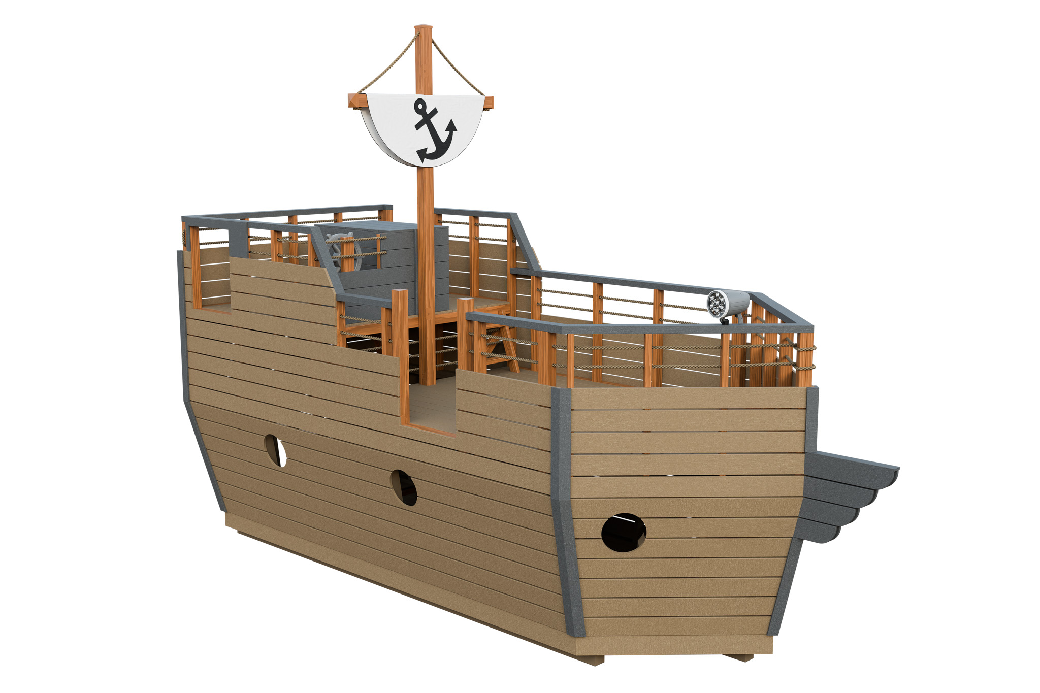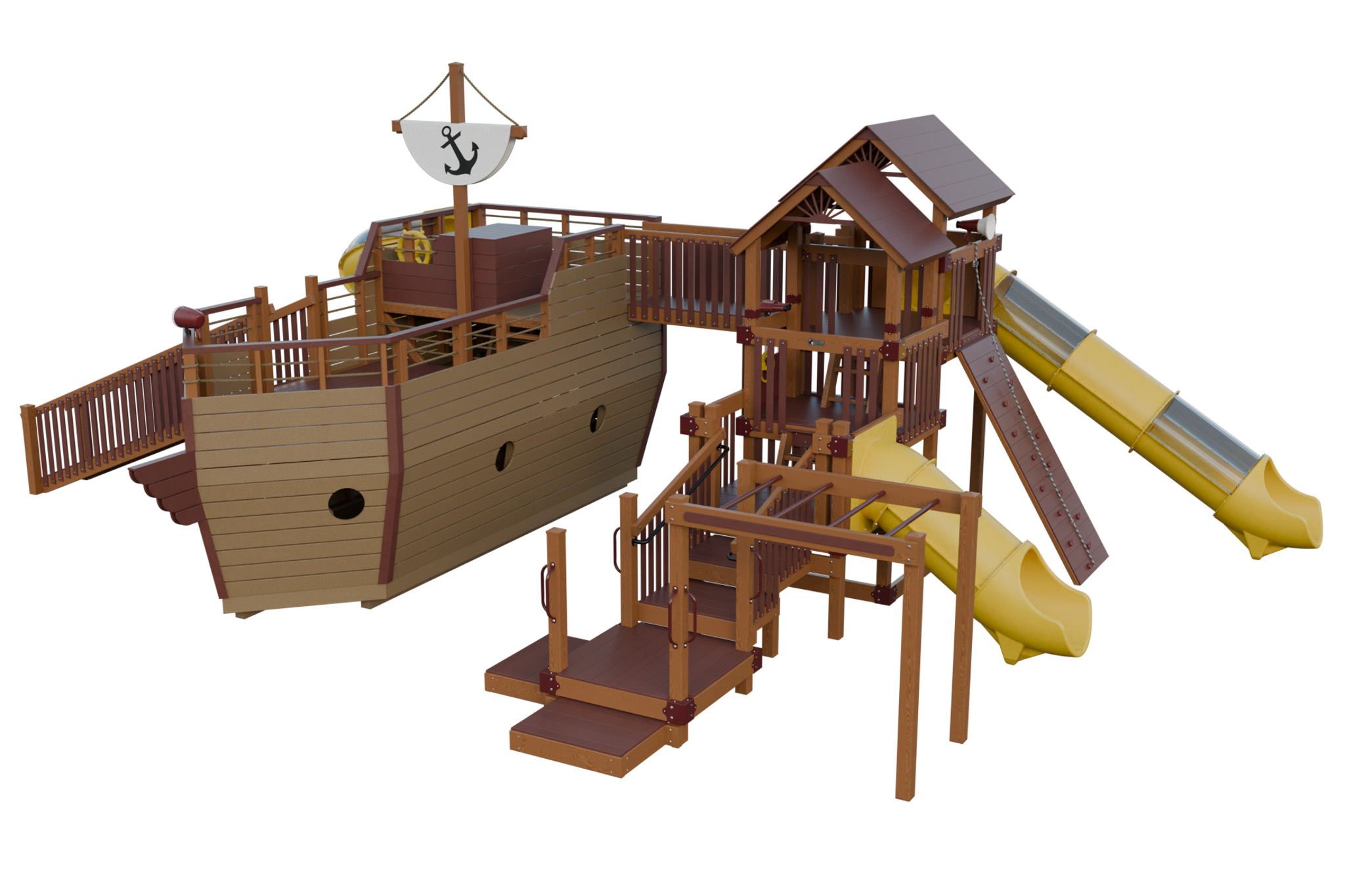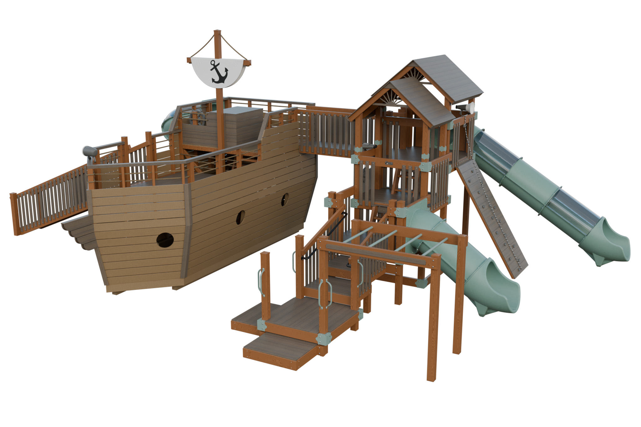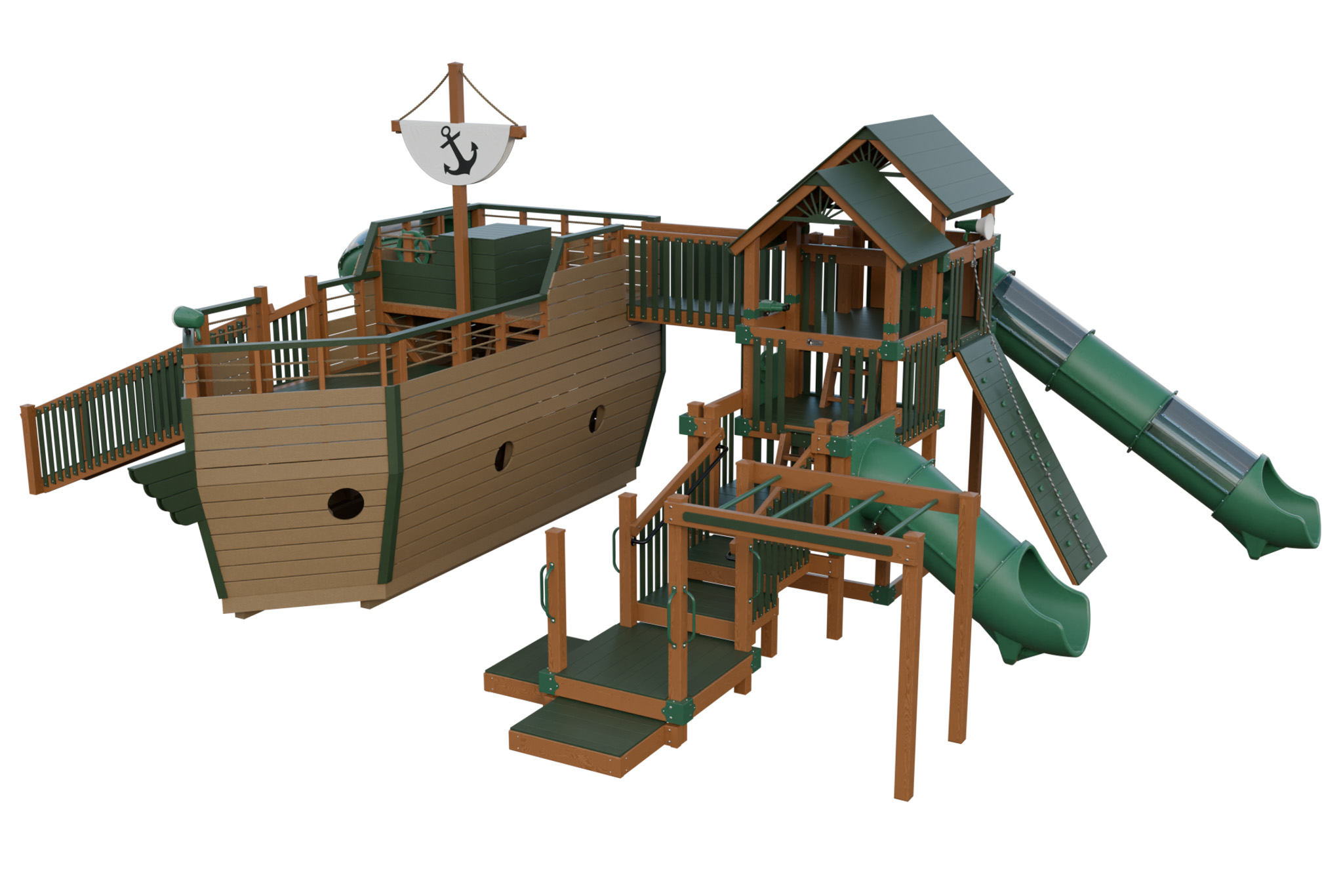 Buccaneer transforms the backyard into a pirate ship. A tower with a ship’s wheel and lookout platform lets kids imagine sailing the seas. They climb rope ladders, slide down a fast chute, and swing on belts and a trapeze bar. This playset builds imagination and physical coordination while the vinyl materials stay smooth and safe. This model includes the Wood Grain Upgrade, a premium vinyl color option that adds to the price.