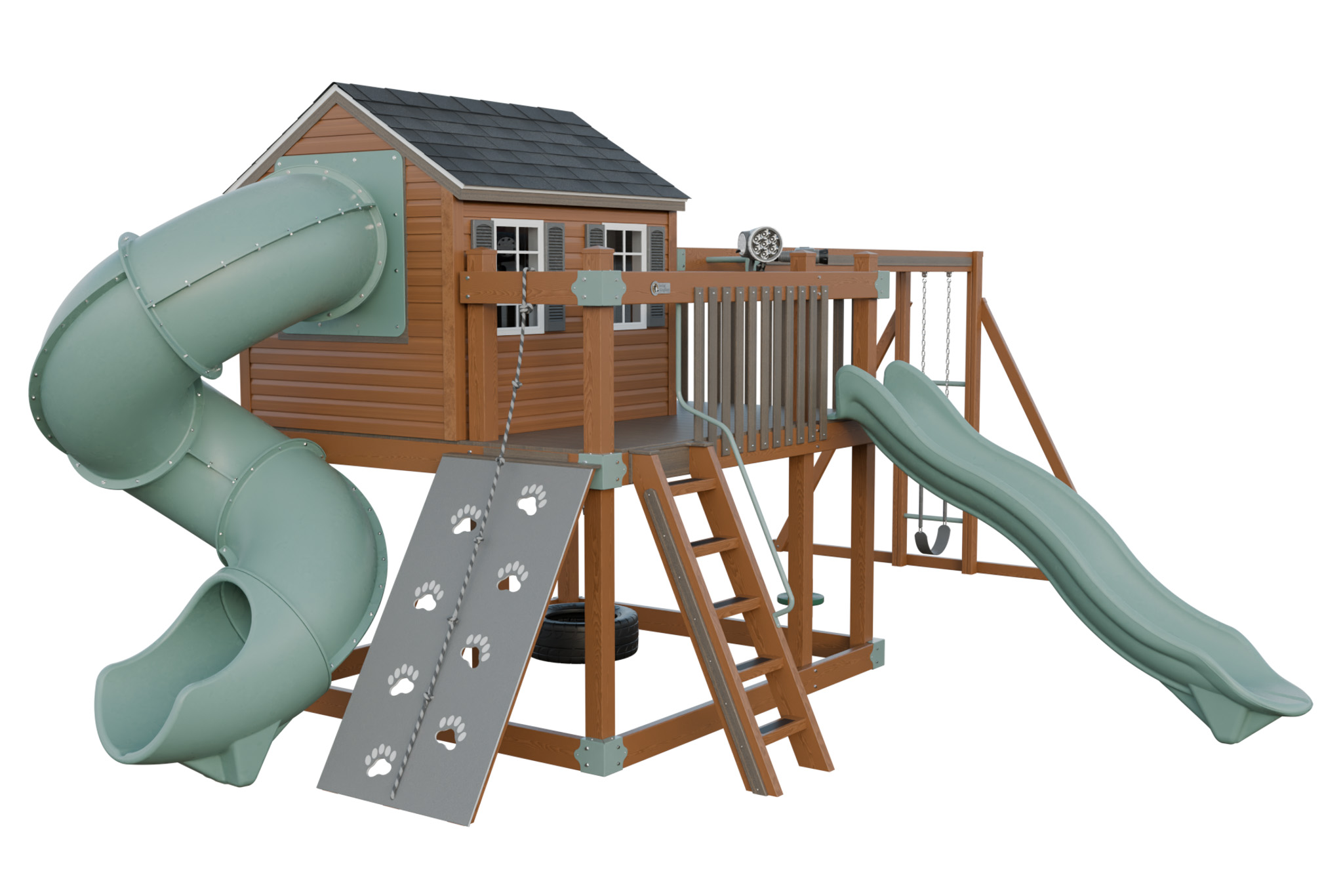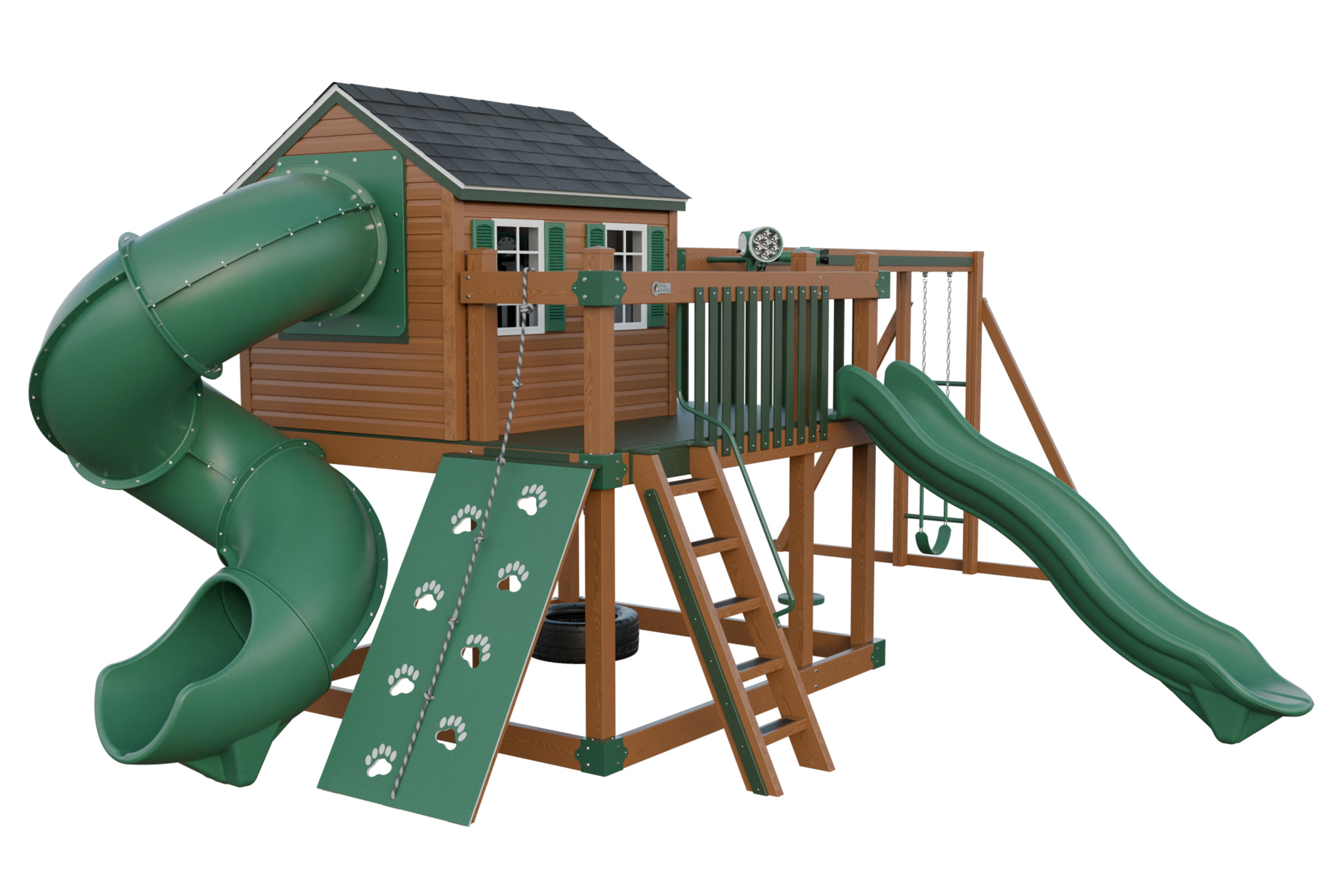 Vinyl playhouse with slide and swings.