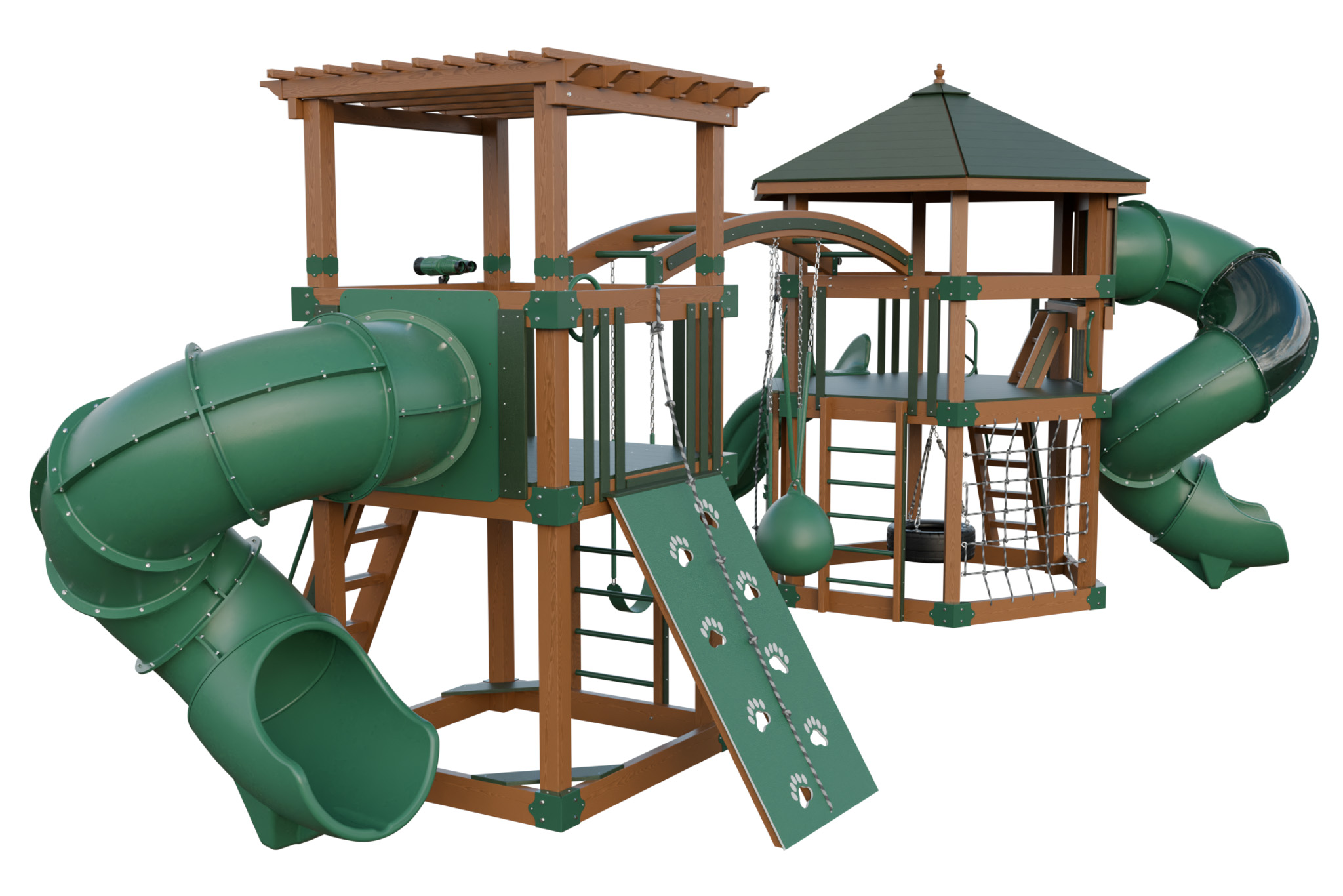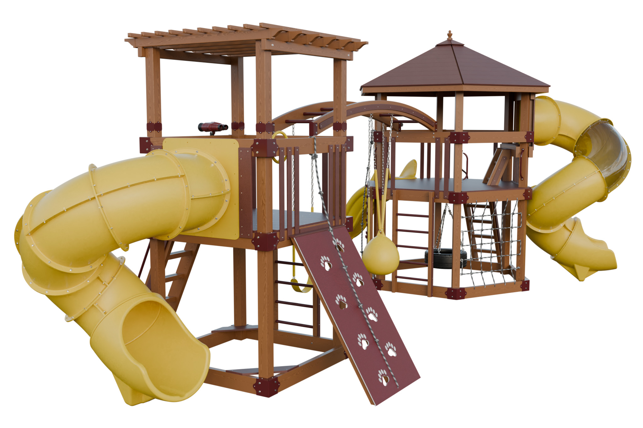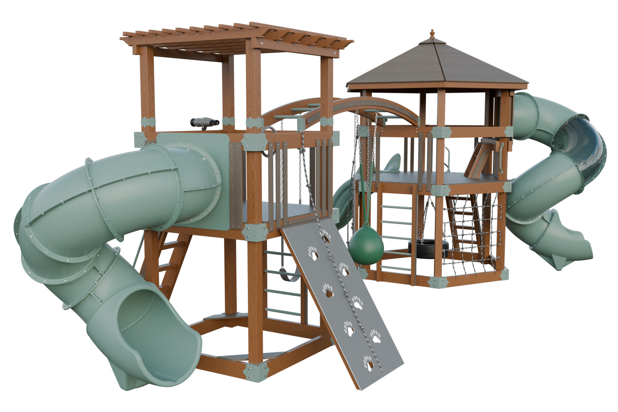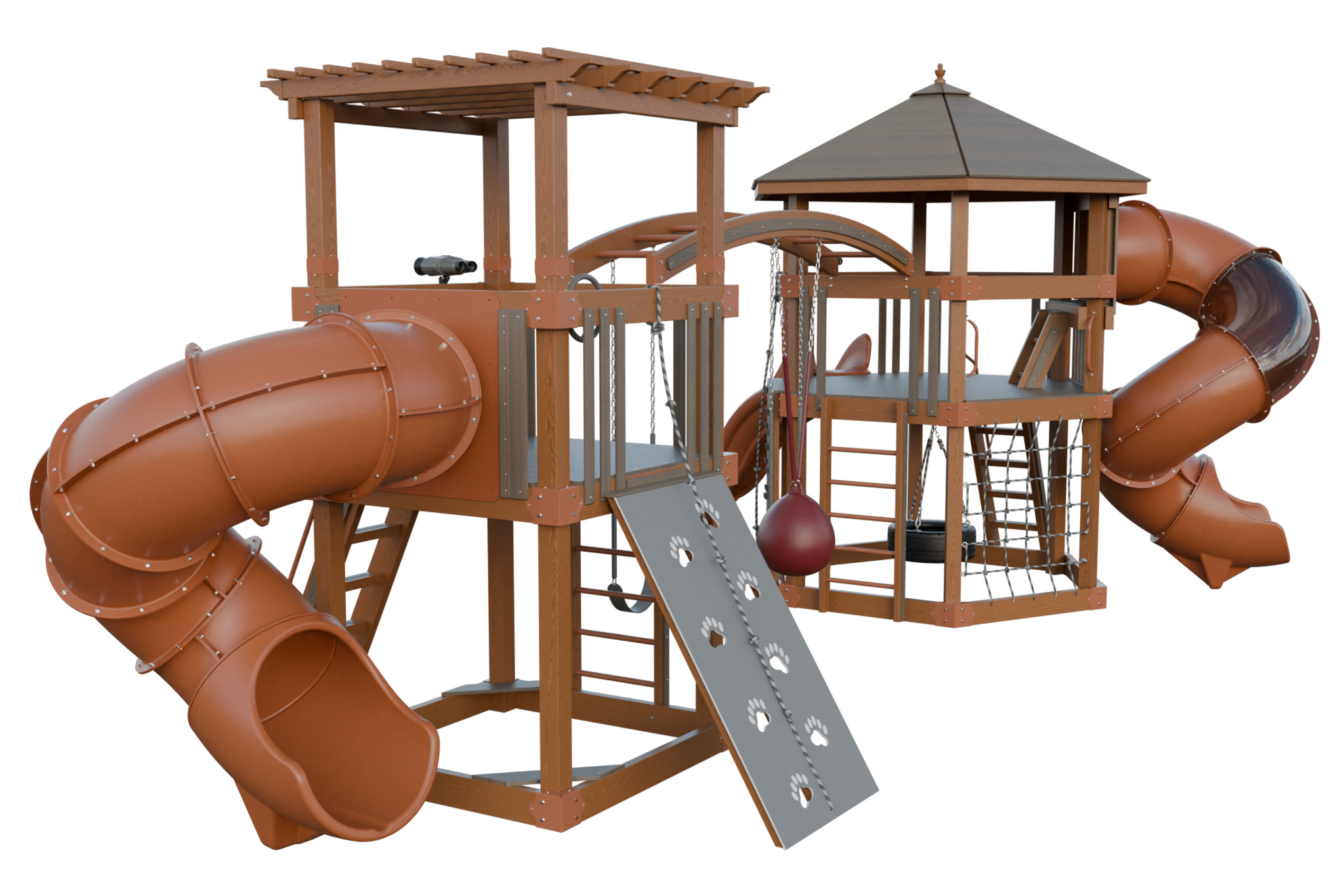 Explorer lives up to its name by offering several towers connected by bridges. Kids traverse the structures, discovering slides, ladders, and swings along the way. This layout builds balance and encourages cooperative play. The durable construction ensures the playset remains a favorite for years. This model includes the Wood Grain Upgrade, a premium vinyl color option that adds to the price.