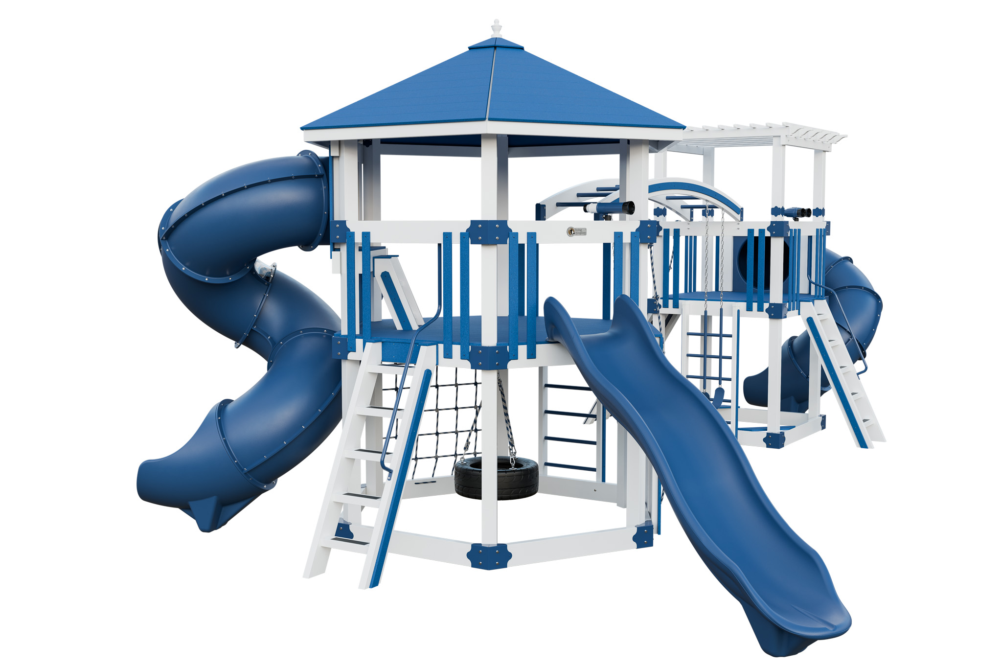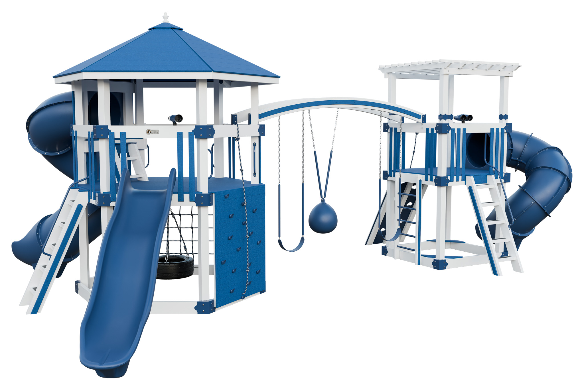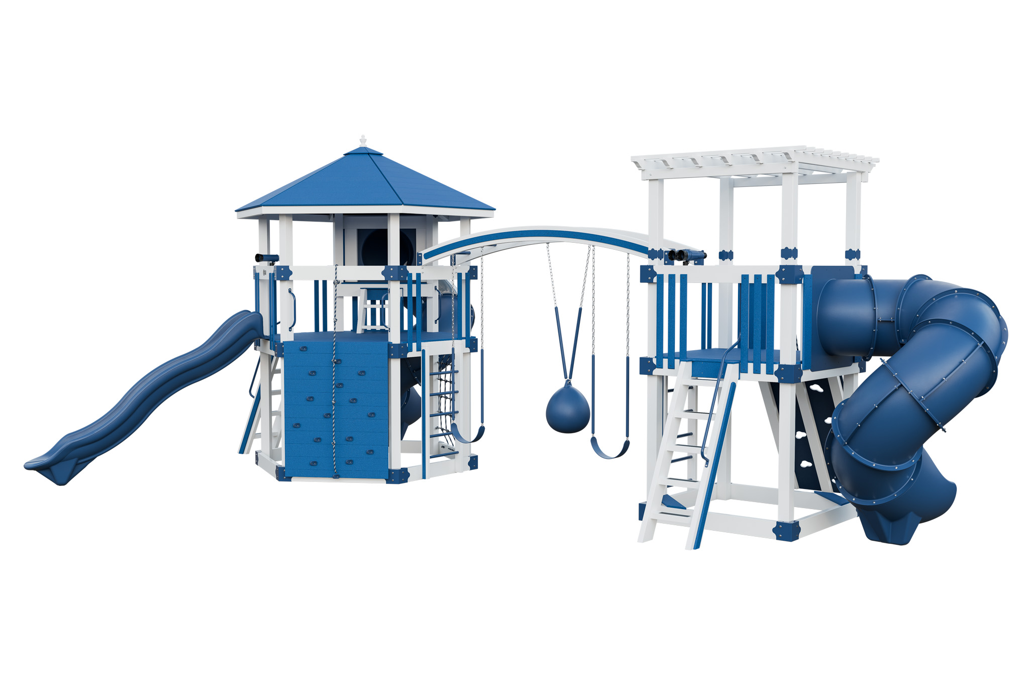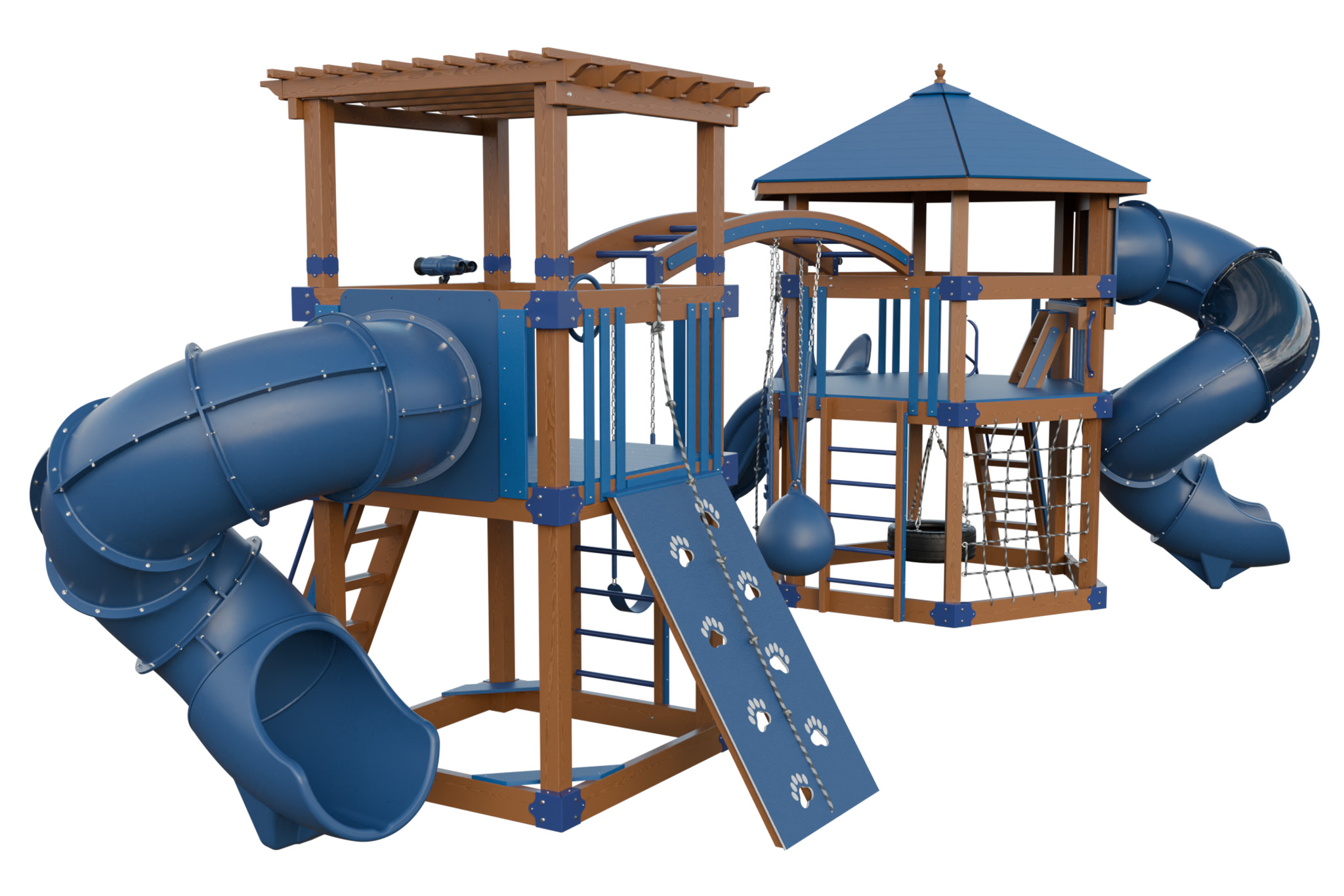 Explorer lives up to its name by offering several towers connected by bridges. Kids traverse the structures, discovering slides, ladders, and swings along the way. This layout builds balance and encourages cooperative play. The durable construction ensures the playset remains a favorite for years. This model includes the Wood Grain Upgrade, a premium vinyl color option that adds to the price.