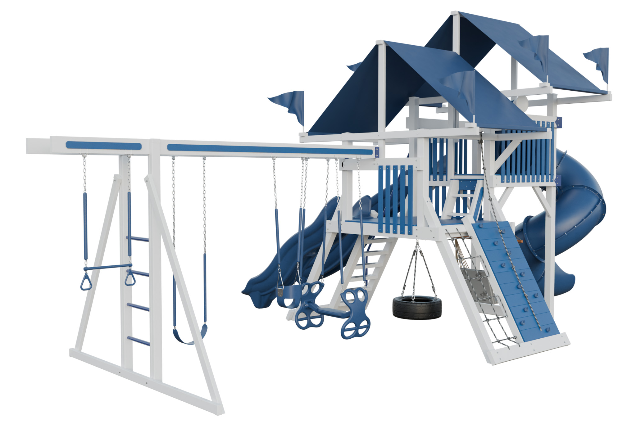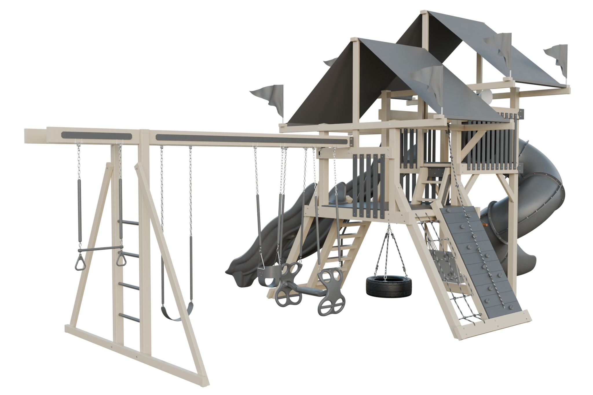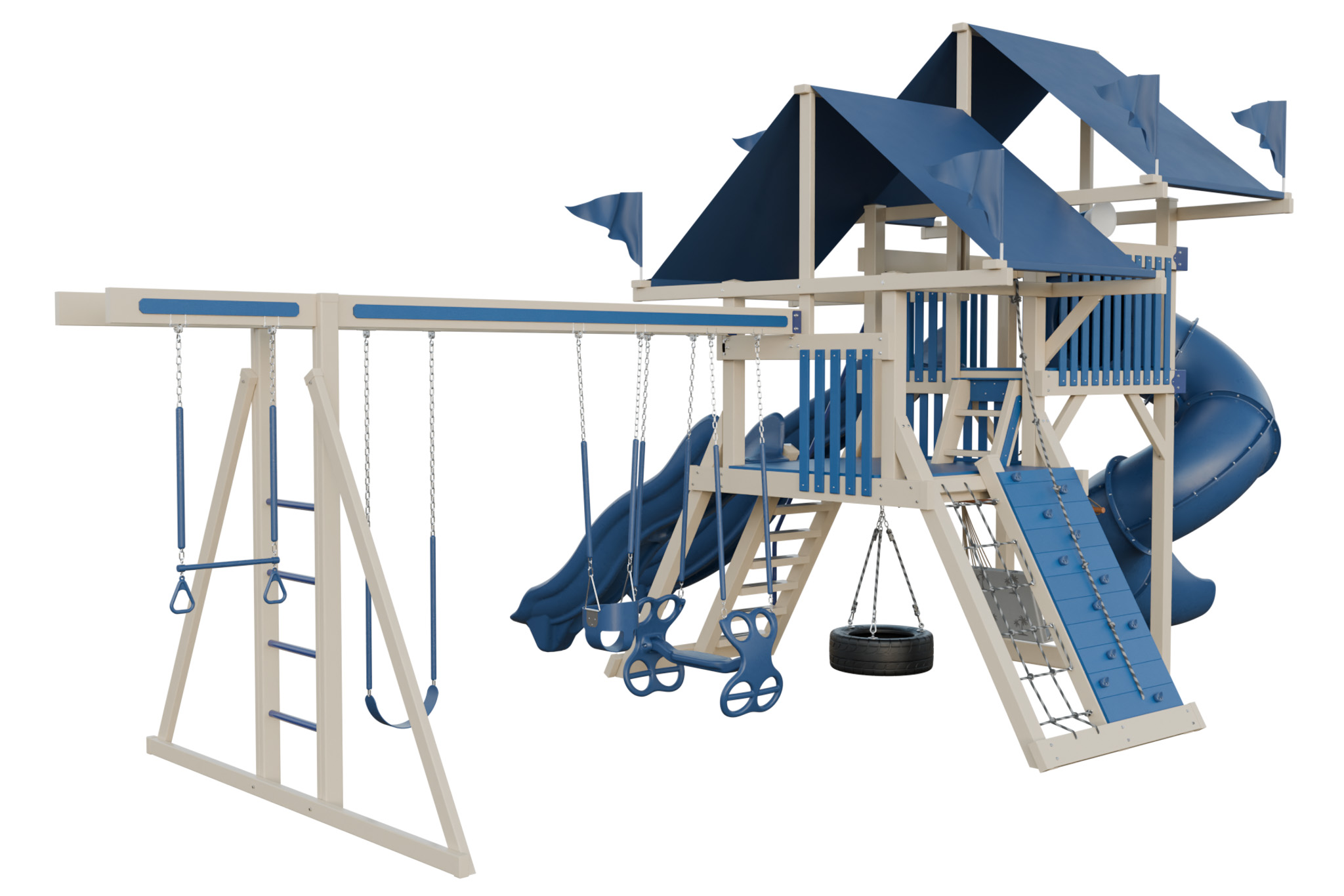 Large playset with 5×5 tower, multiple slides, rock wall, rope bridge, and swings.