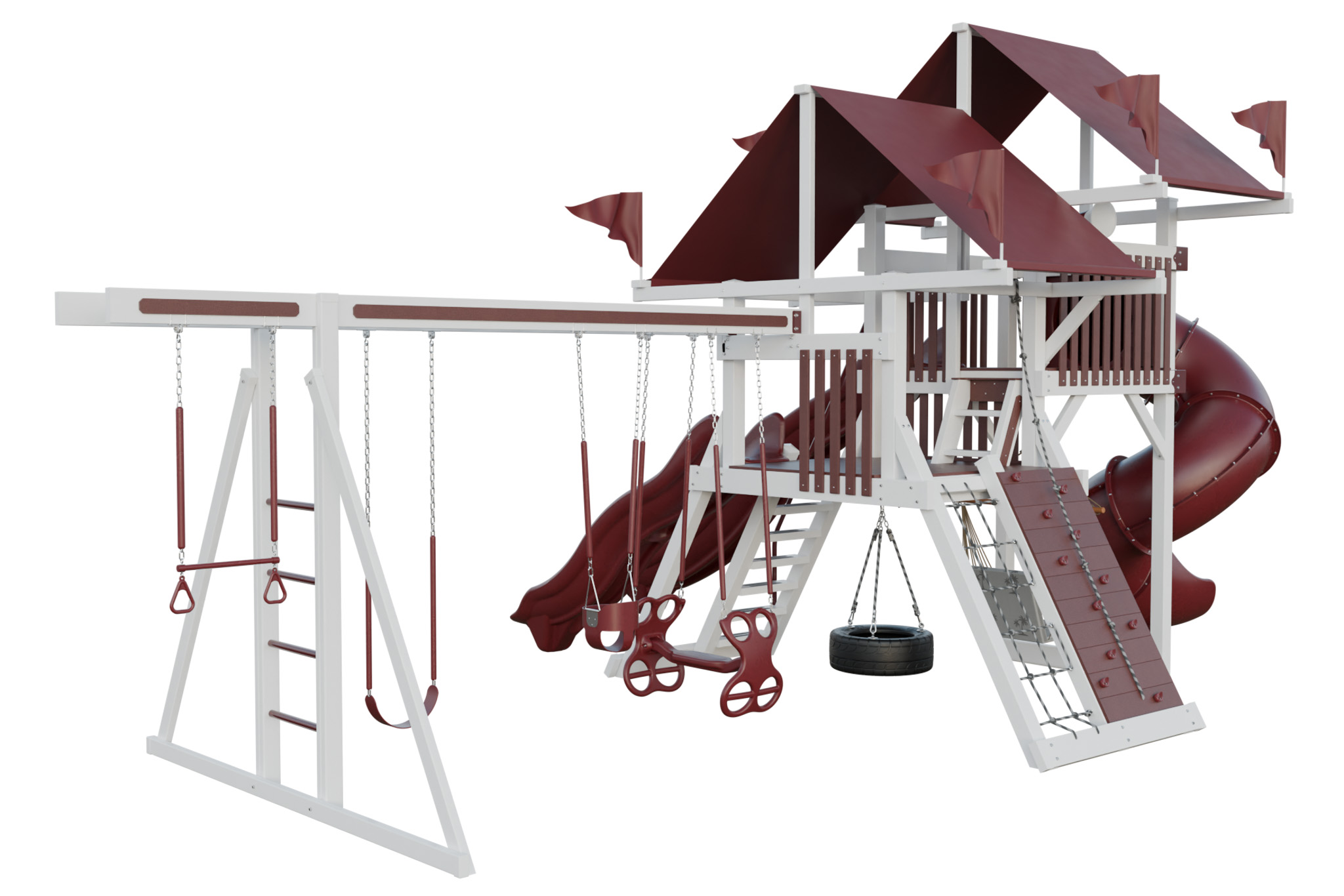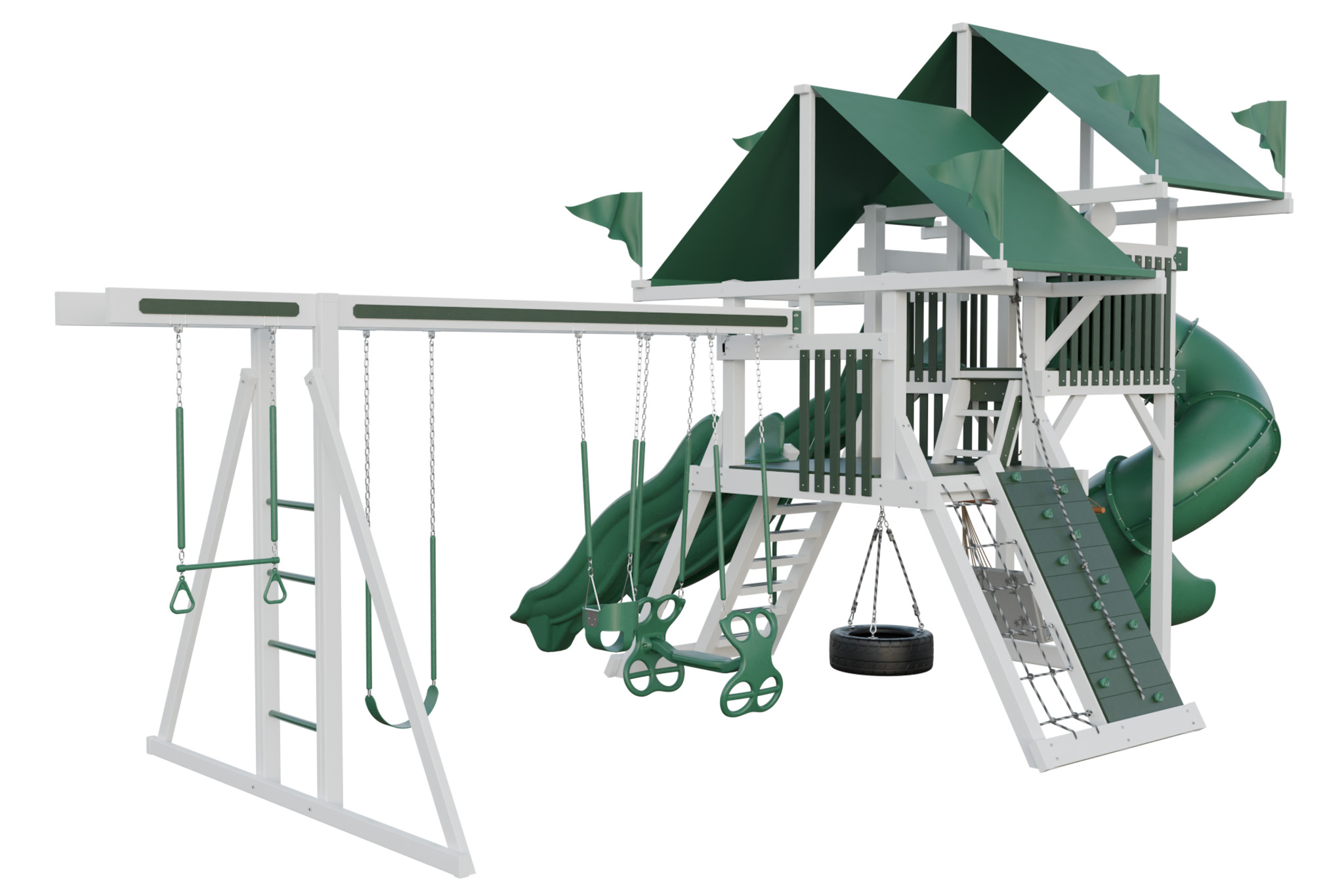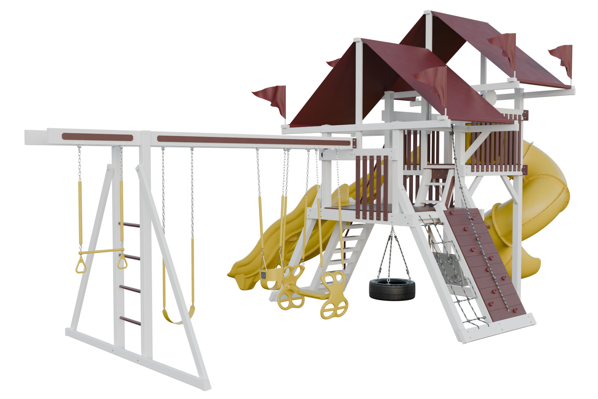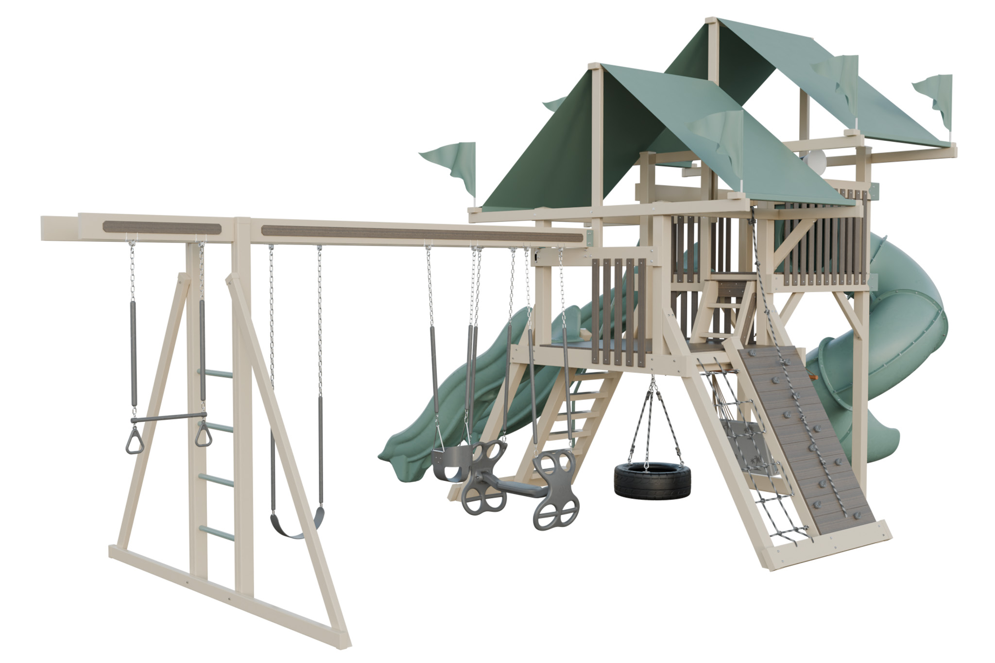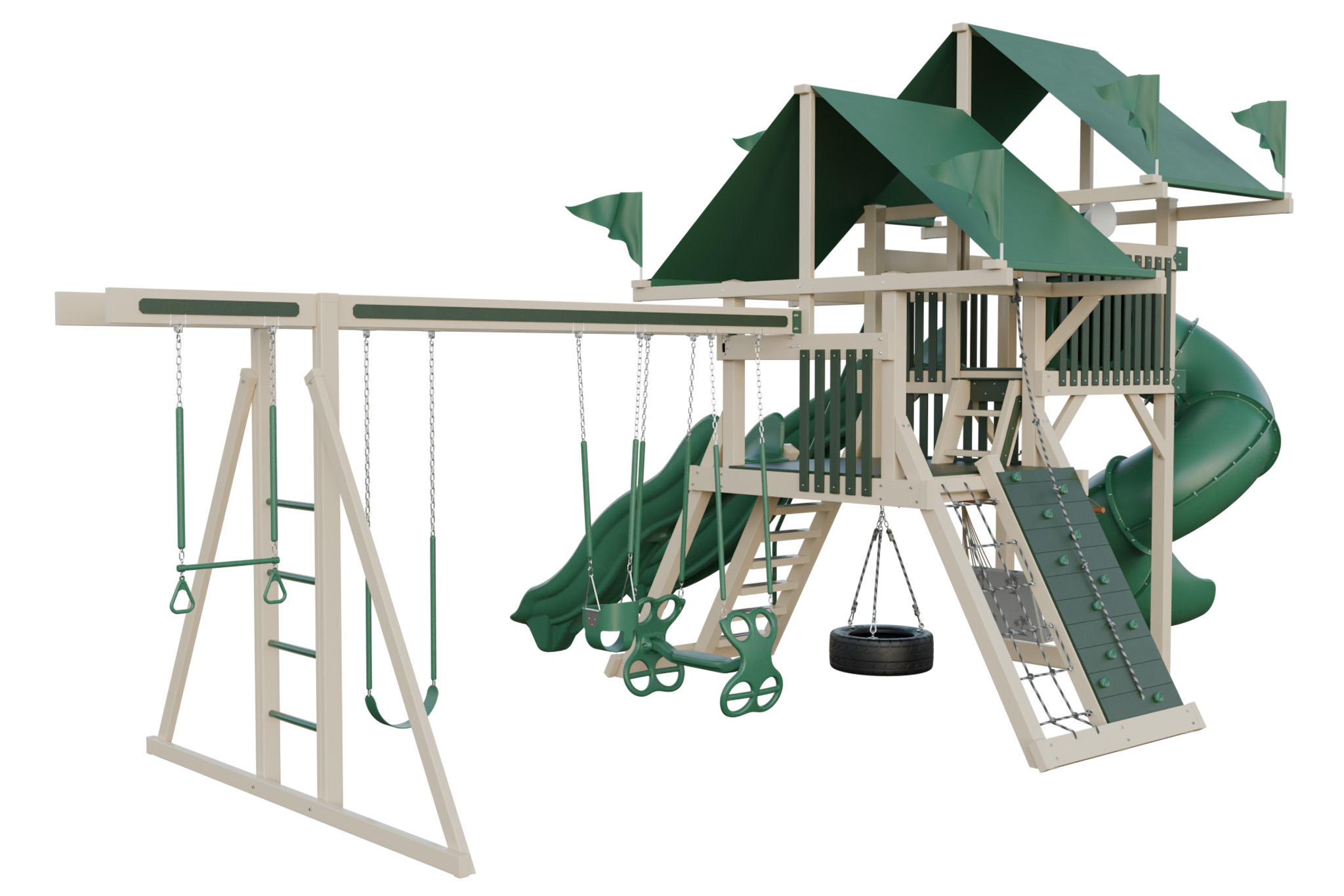 Mega Climber 55 lives up to its name with a big tower and a range of climbing and sliding features. Kids cross rope bridges, scale a rock wall, and descend down long slides. The set includes multiple swings, so several children play together. Durable vinyl and stainless hardware handle heavy use. This playset creates a focal point for active group play in large yards.