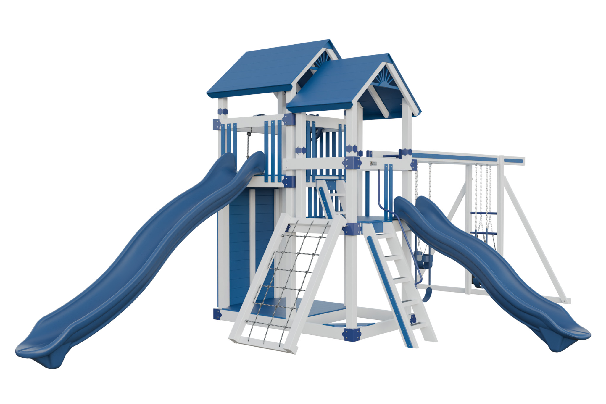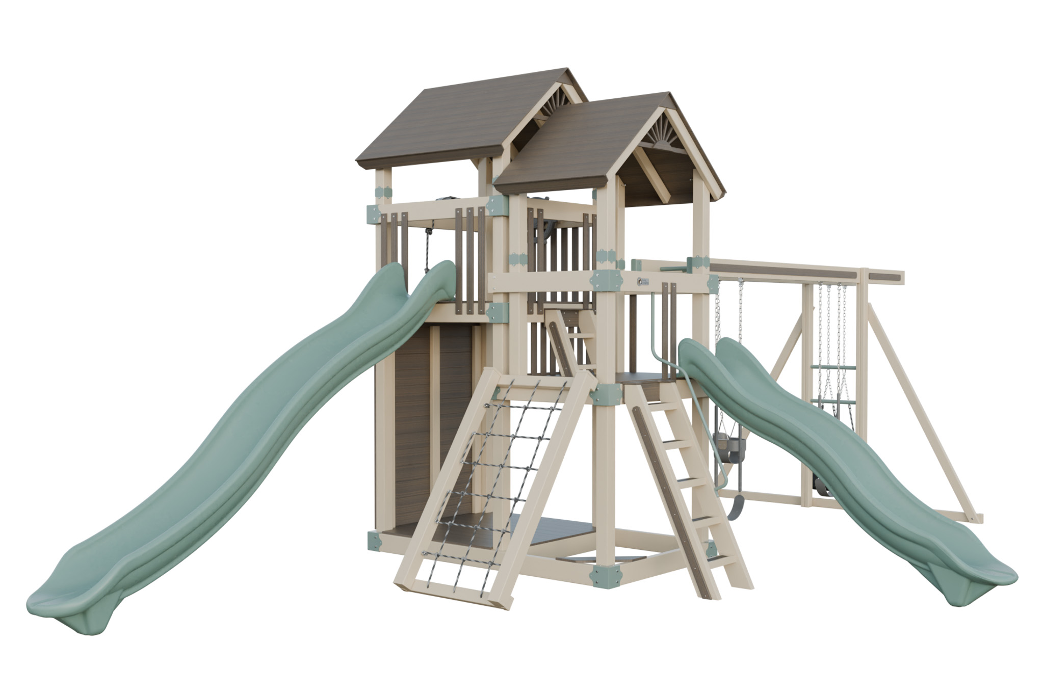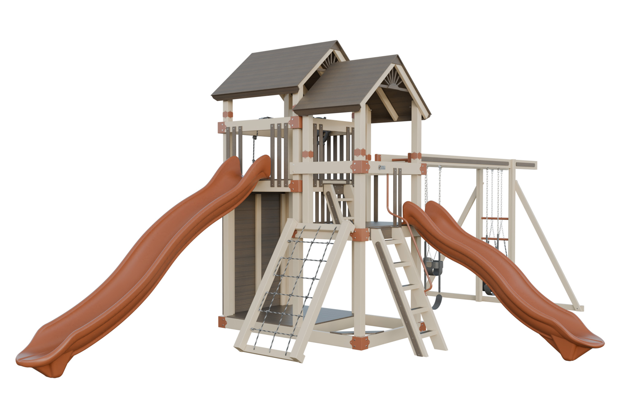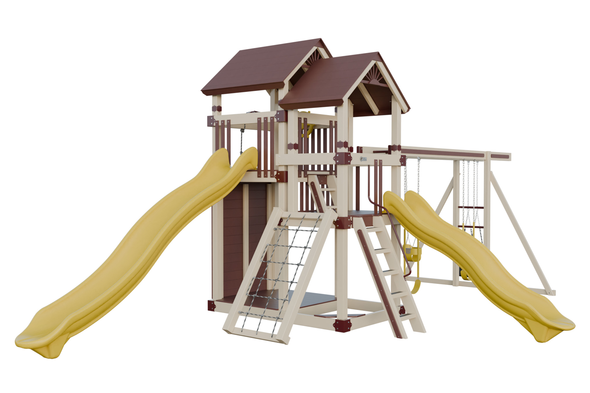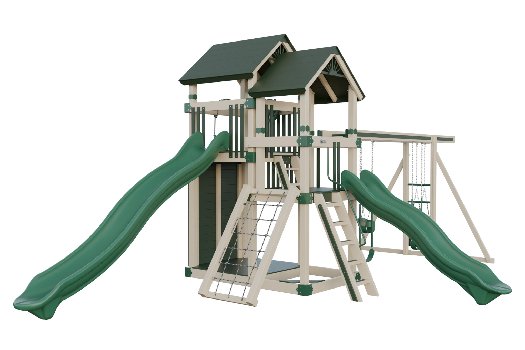 Super 59 Adventure connects two deck heights to create a small obstacle course. Children cross between platforms through a crawl tunnel, race down different slides, and explore the swings. The variety keeps them moving and builds coordination. Vinyl construction eliminates splinters, and the hardware stays strong. This playset offers a backyard adventure that inspires imagination and active play.