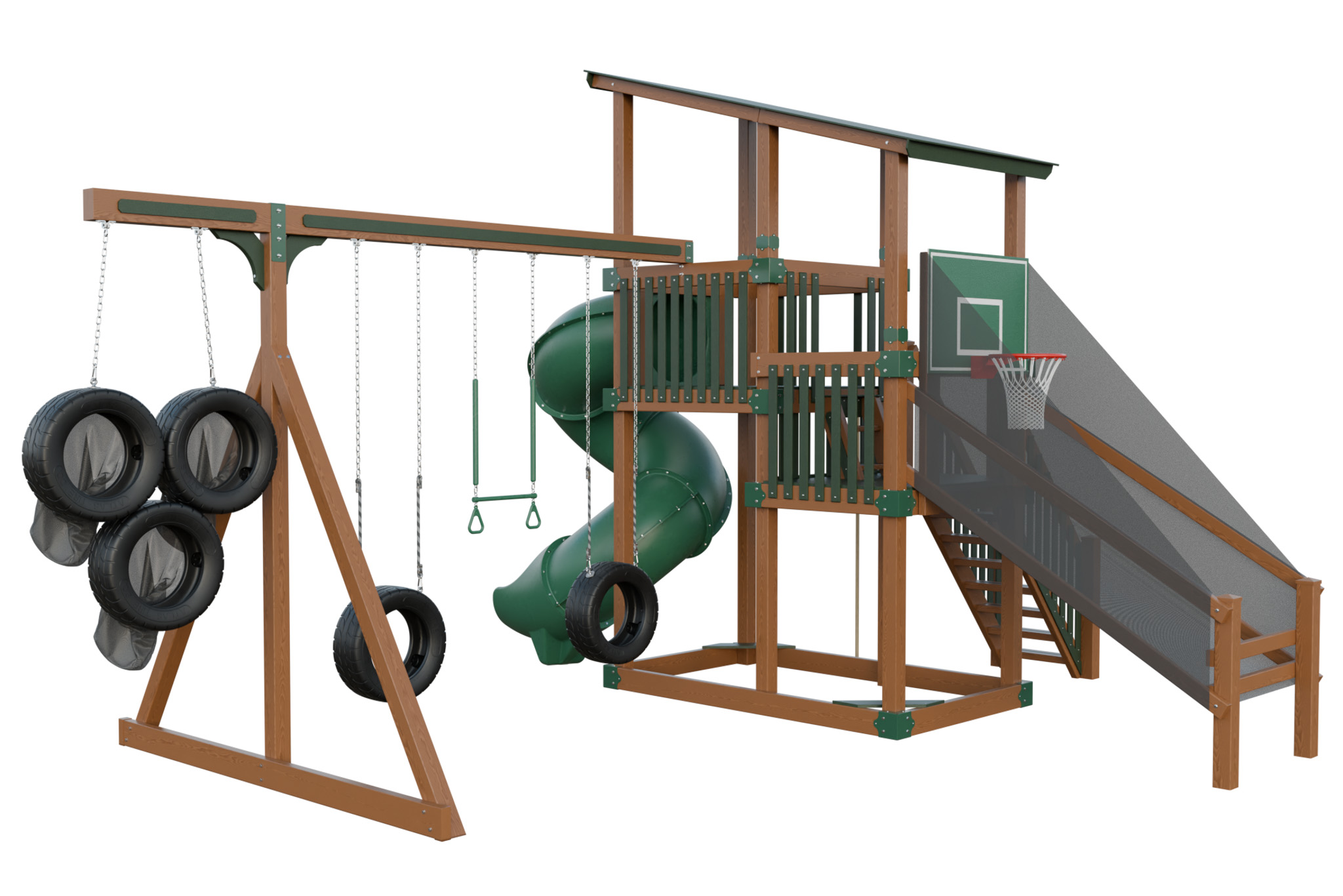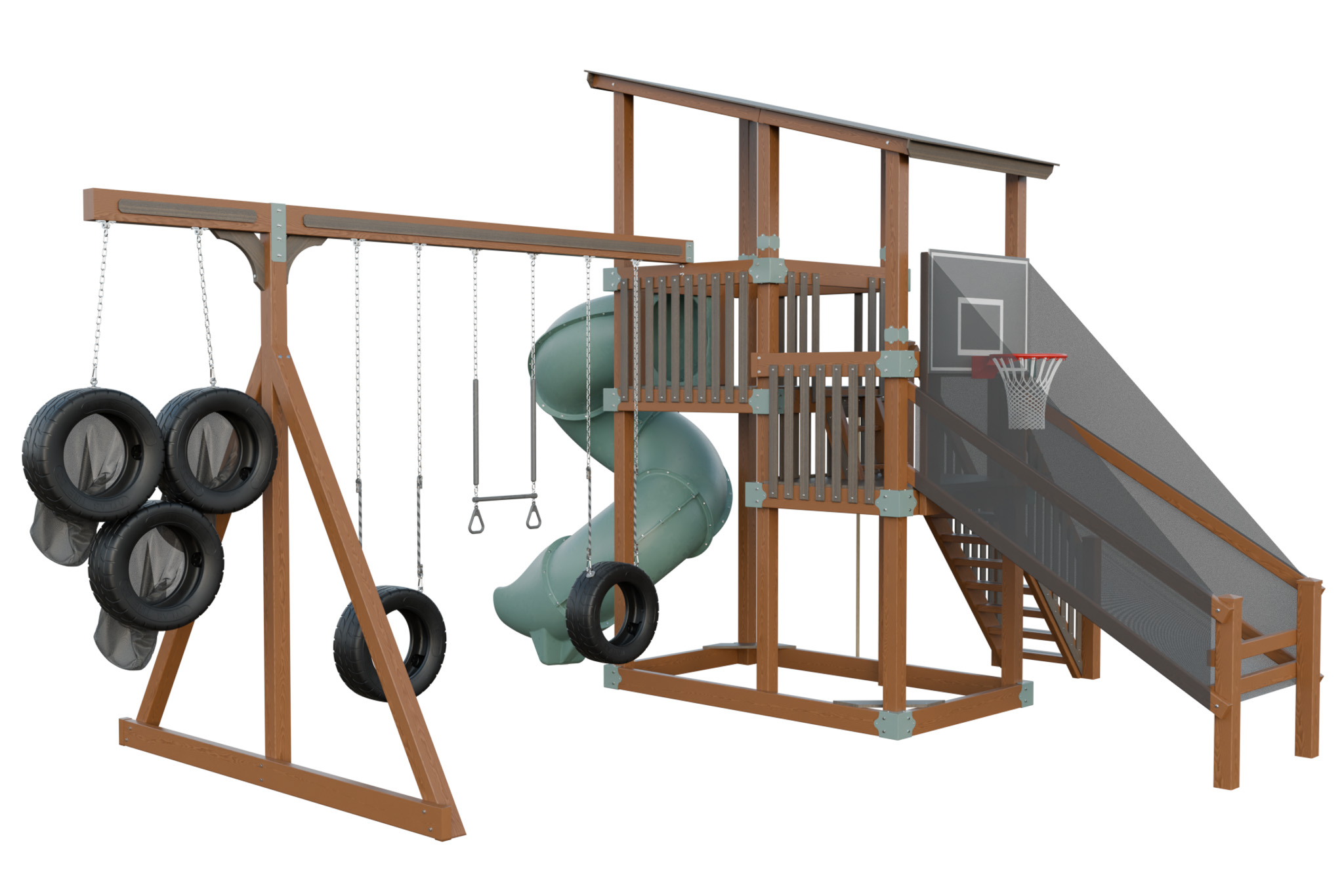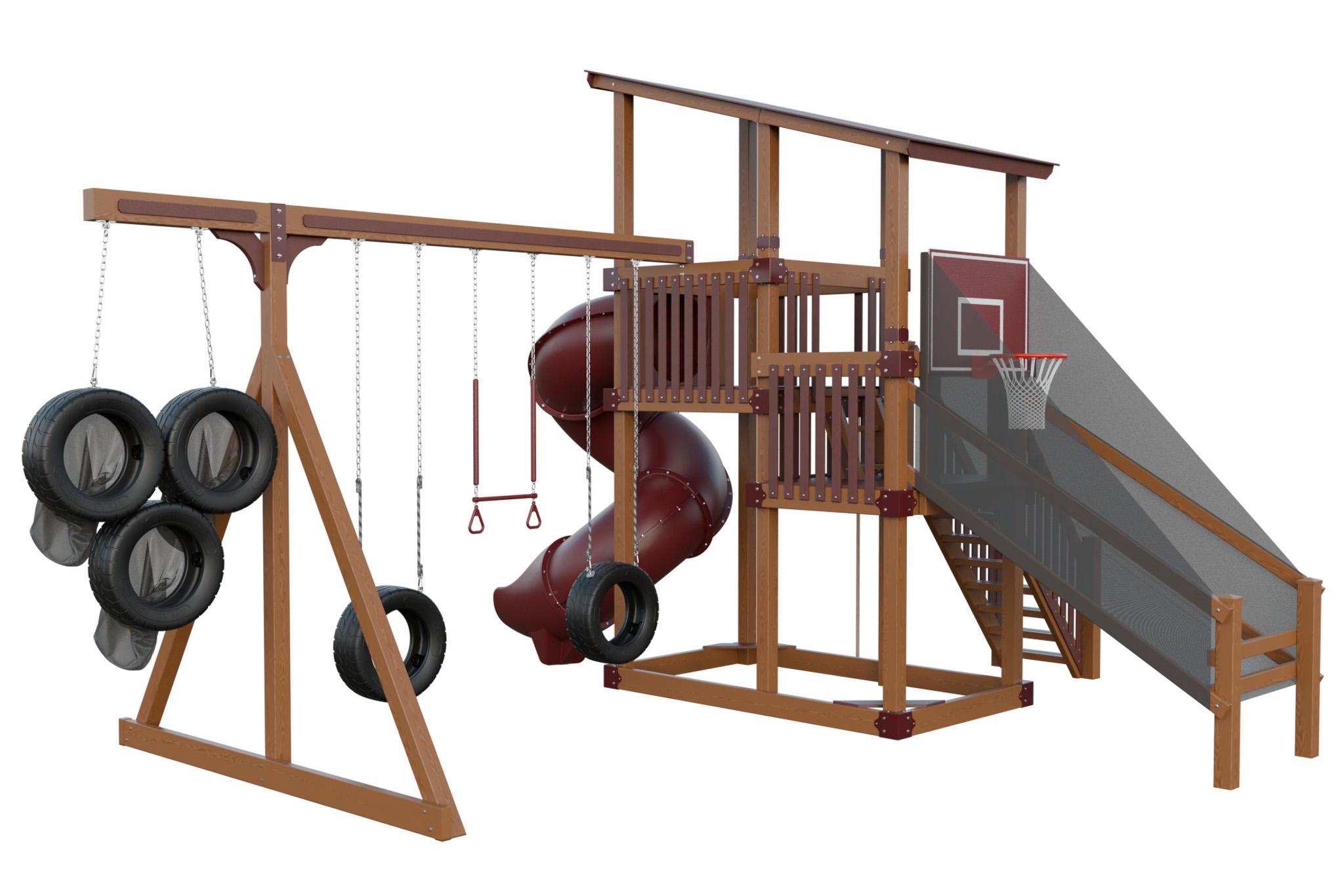 Super 59 Sports Tower brings athletic fun to the backyard. The elevated tower leads to a fast slide, while the swing beam supports a belt swing, a trapeze bar, and other sports equipment. Optional accessories such as a basketball hoop or climbing rope promote physical development. Kids enjoy friendly competition and outdoor exercise. Durable materials keep the structure safe and attractive season after season. This model includes the Wood Grain Upgrade, a premium vinyl color option that adds to the price.